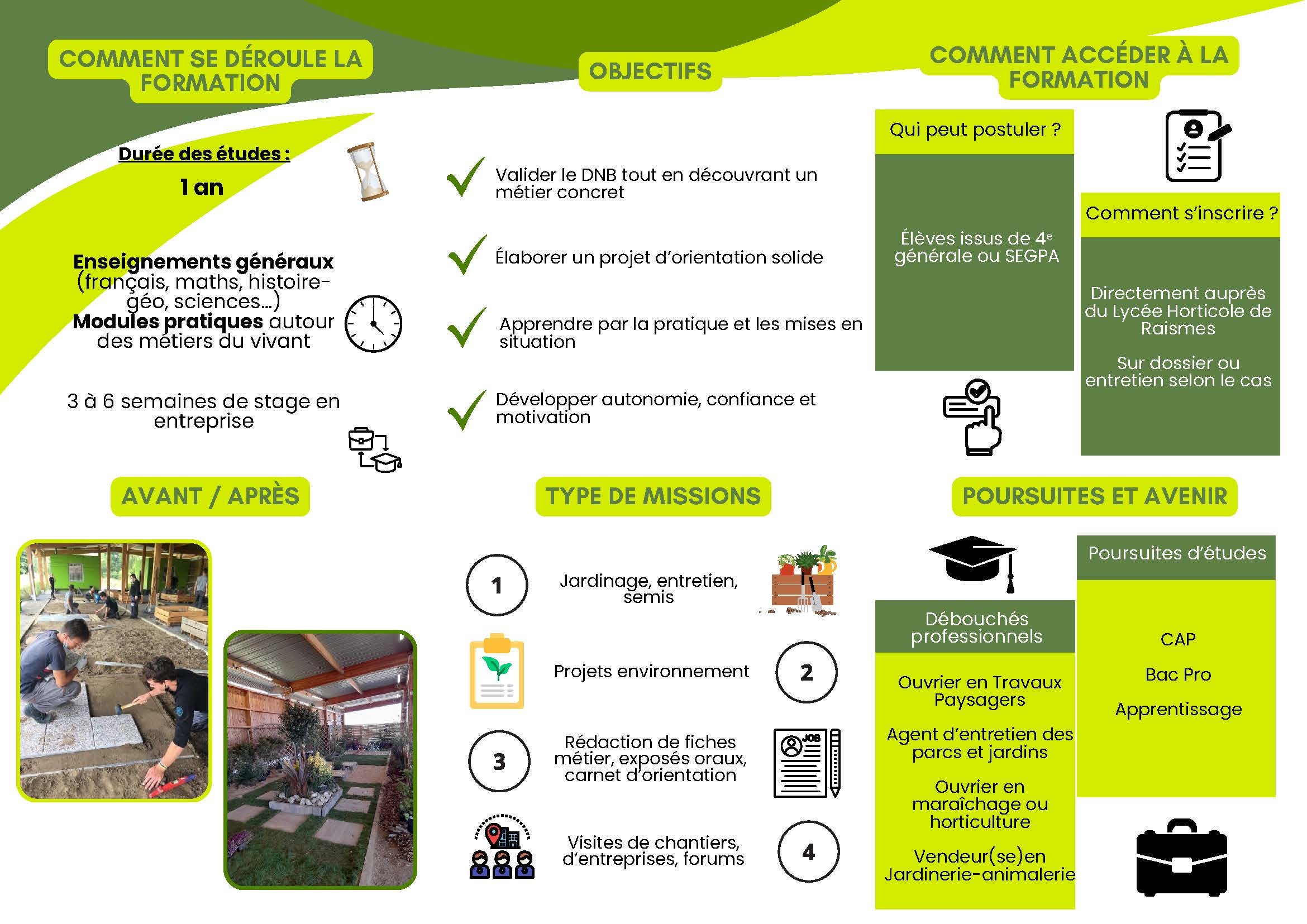 La 3ème de l’enseignement agricole est une classe à projet professionnel qui combine les apprentissages classiques et la découverte active de plusieurs secteurs : agriculture, environnement, horticulture, animalerie, paysage, vente…